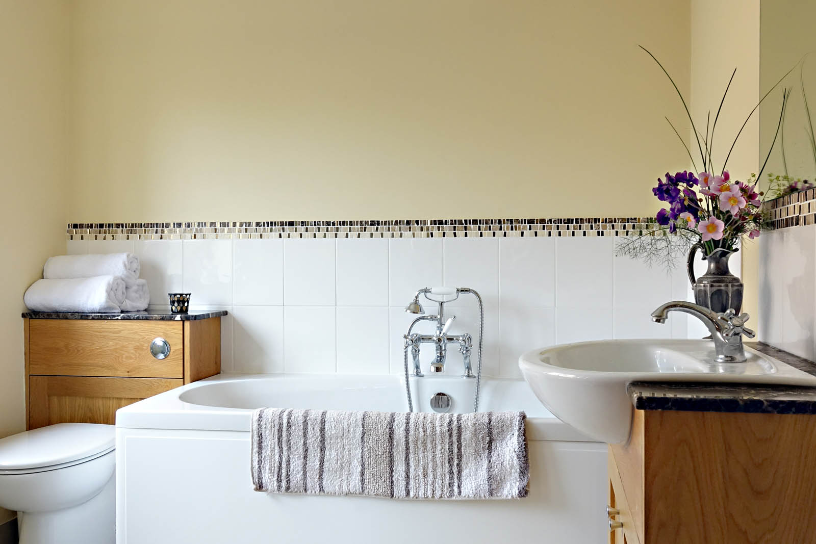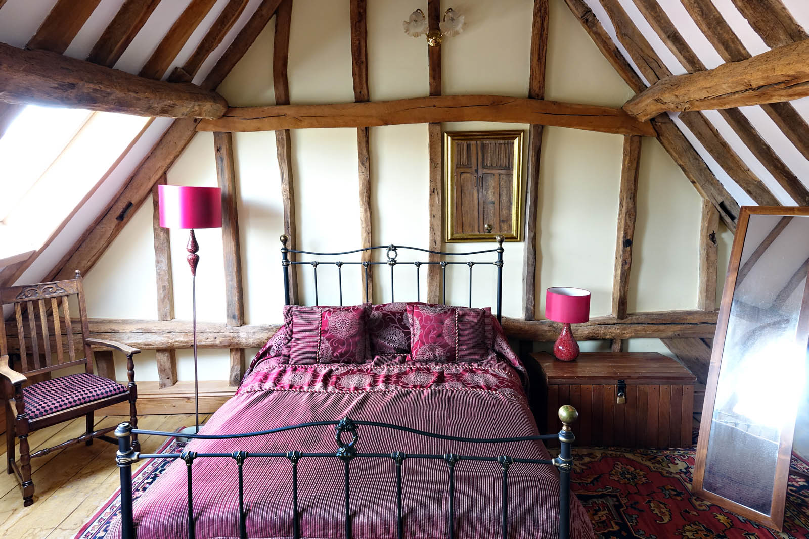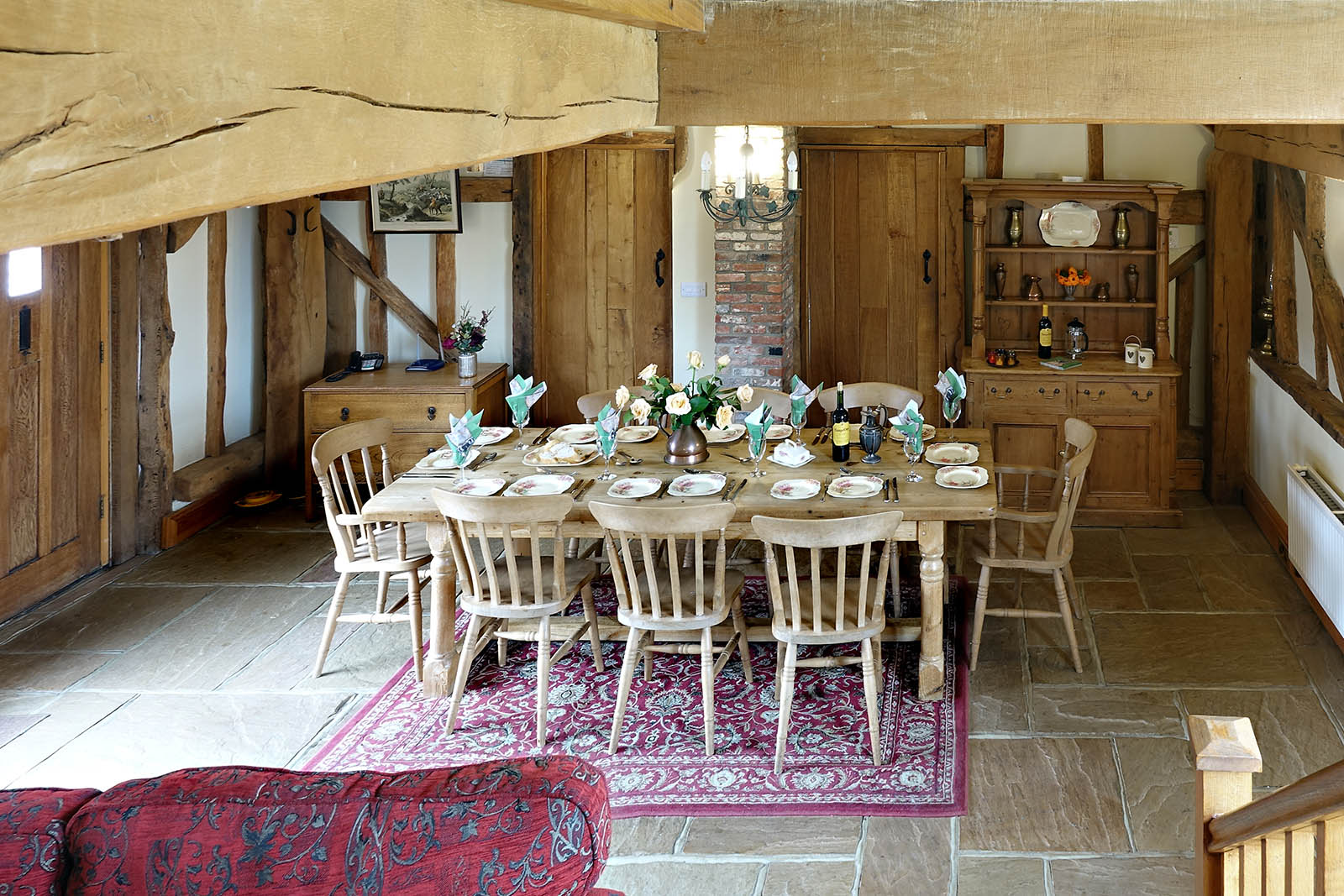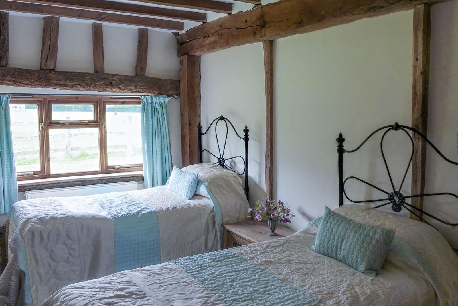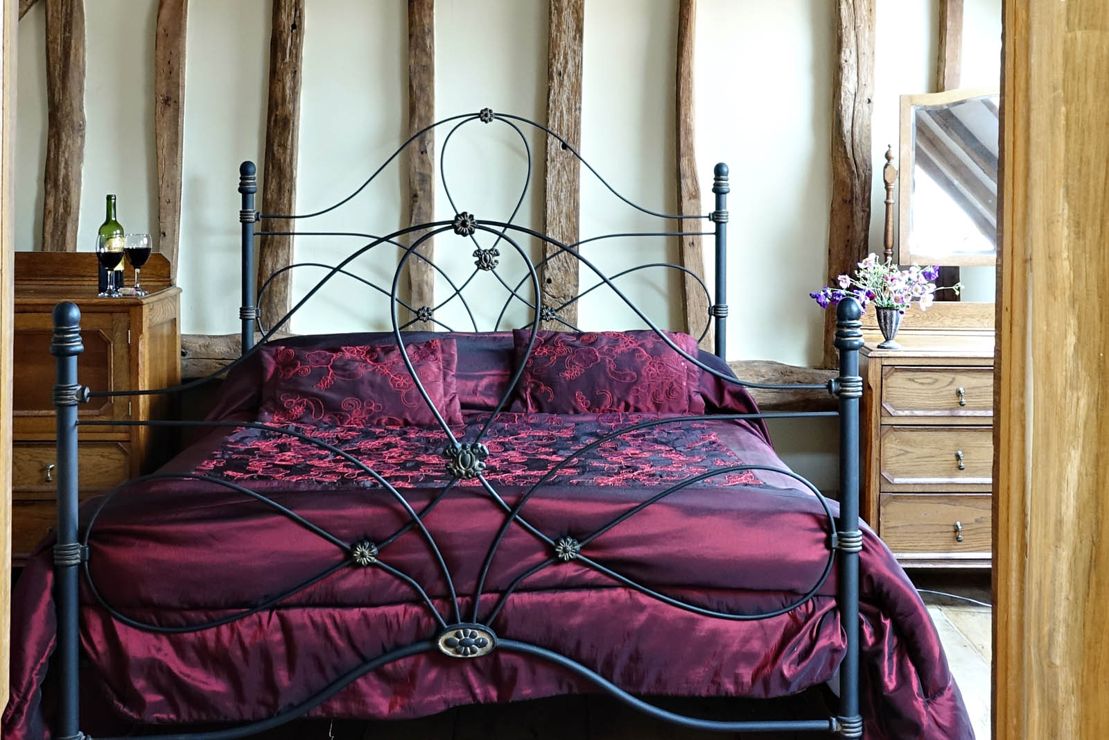 The Harvest Barn is the largest conversion of the three and can sleep up to eight people. Upstairs it boasts two vast bedrooms with vaulted ceilings, lots of beams and oak floorboards throughout. Both rooms have a king size bed with attractive ironwork bedstead. There is a smaller bathroom with a bath.